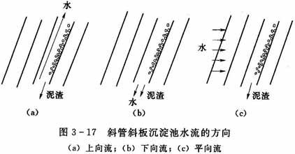在斜板斜管沉淀池中,按照水流流過斜板的方向,可分為上向流、下向流和平向流三種,如圖3-17和圖3-18所示。水流由下向上通過斜管或斜板,沉淀物由上向下,它們的方向正好相反,這種形式稱作上向流(也稱異向流)。水流向下通過斜管或斜板與沉淀
