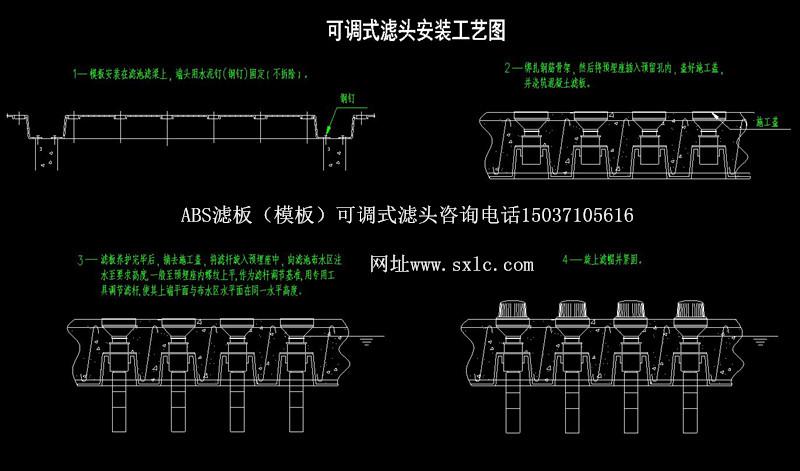 水廠濾池氣水反沖洗濾池常用的濾板有預制濾板和現(xiàn)澆整體濾板兩種:濾頭分為固定式和可調式兩種.固定式適應于預制濾板:可調式長柄濾頭特別適應于現(xiàn)澆濾板.也適應于預制濾板.QSK-ll型可調式長柄濾頭原料采用高強度ABS顆粒樹脂(簡稱ABS工程塑料)經高溫熱溶由精密磨具成型。可調式濾頭主要用:濾帽、濾桿、預埋座組成,濾桿上設有調節(jié)螺紋,可供上下調節(jié);且設有調節(jié)瓣與預埋座內調節(jié)瓣防脫條結合,可控制濾桿調節(jié)精度,同時固定其位置。
